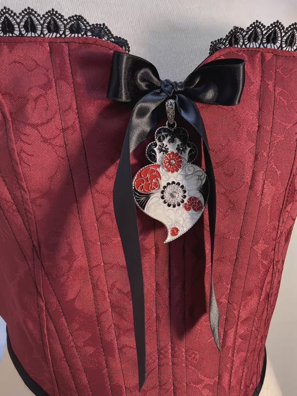 A strapless corset, with a sweetheart neckline, in a burgundy baroque fabric. The neckline is adorned by a black victorian-style lace.