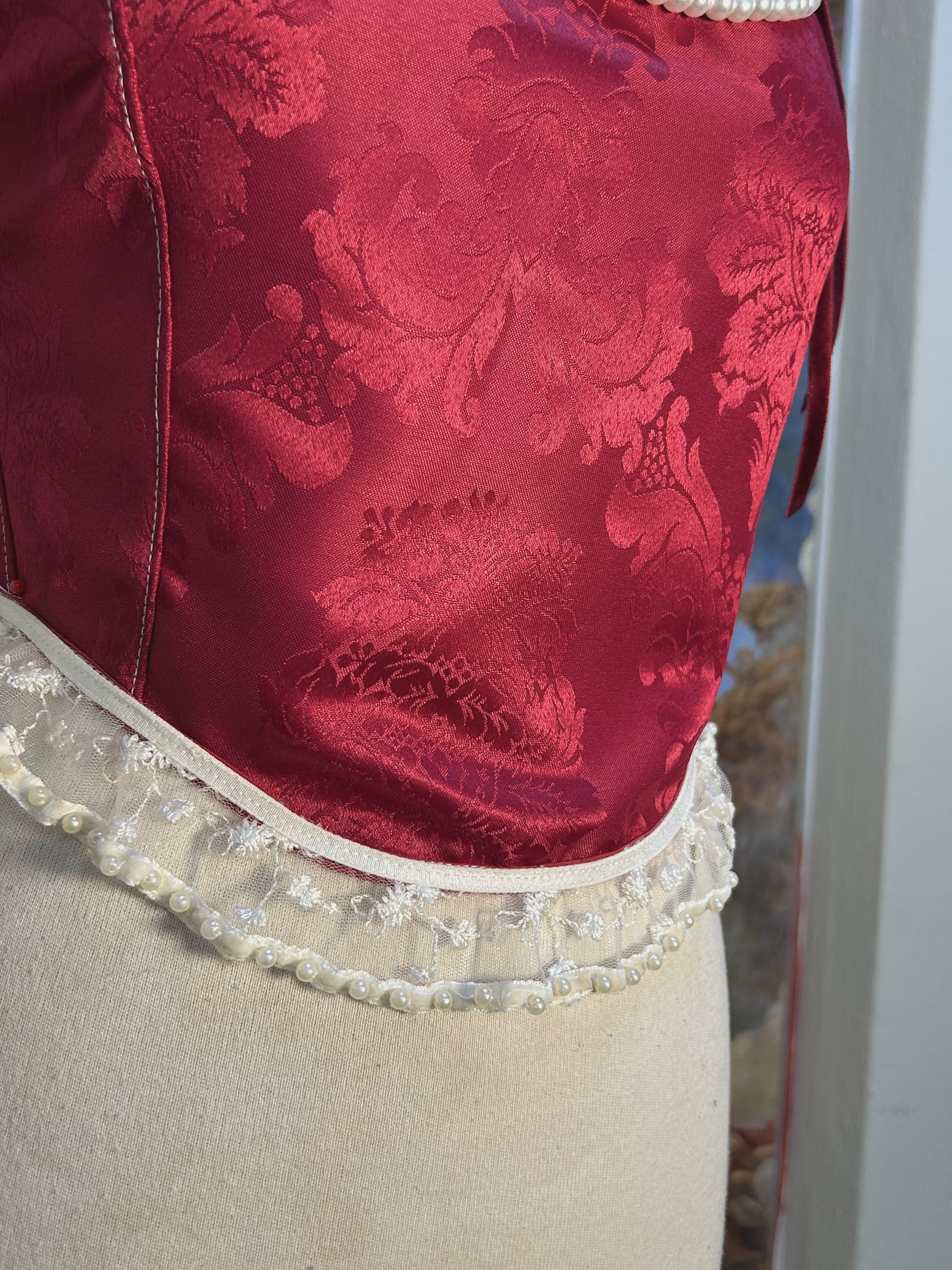 In a baroque burgundy fabric, this piece has the straps closing on the chest (with matching velvet ribbons) and hand sewn pearls around the entire neckline.
