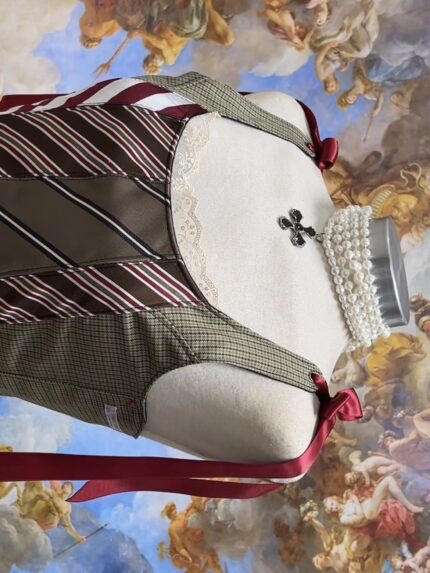 Its an older design so it has a slightly shorter silhouette, repurposed fabric for the lining and the back closes with metal rings (and not eyelets, like the current pieces do).