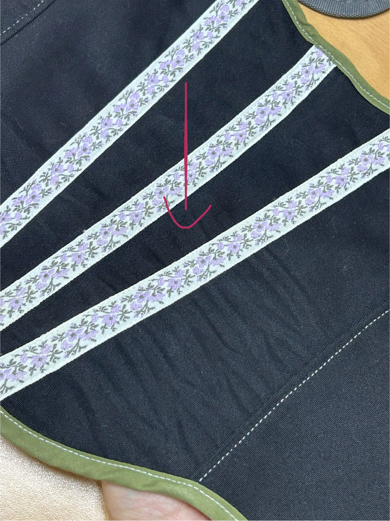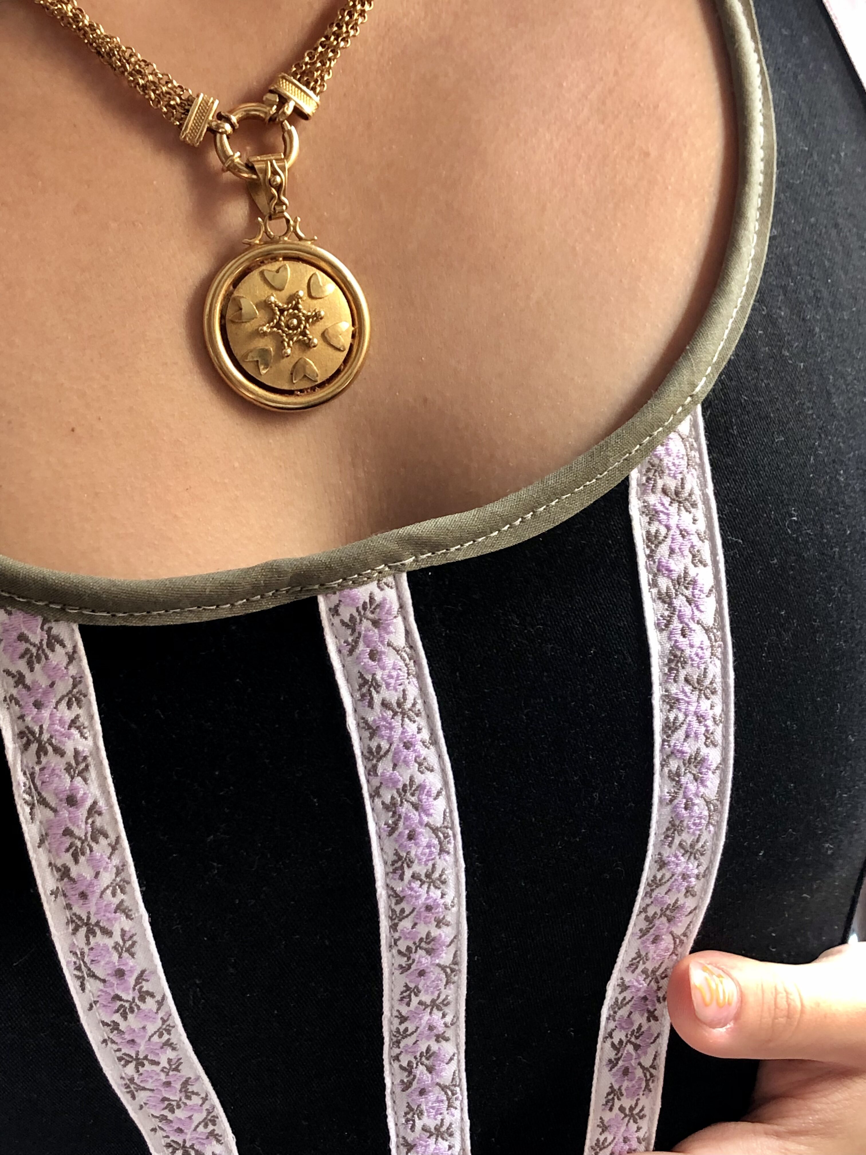 Upcycled from a black pair of jeans, this piece includes an olive green cotton bias tape on the neckline and bottom edge.