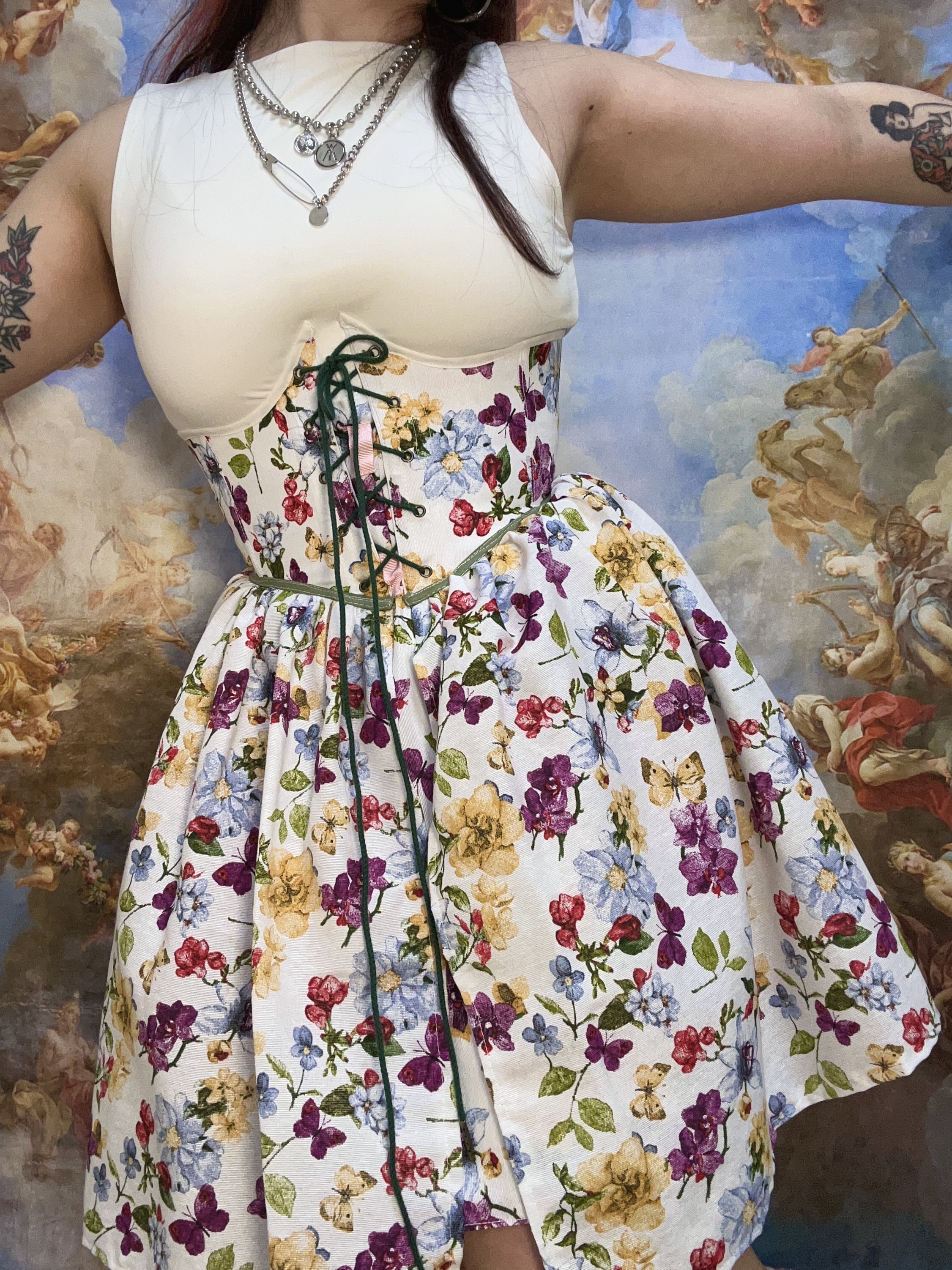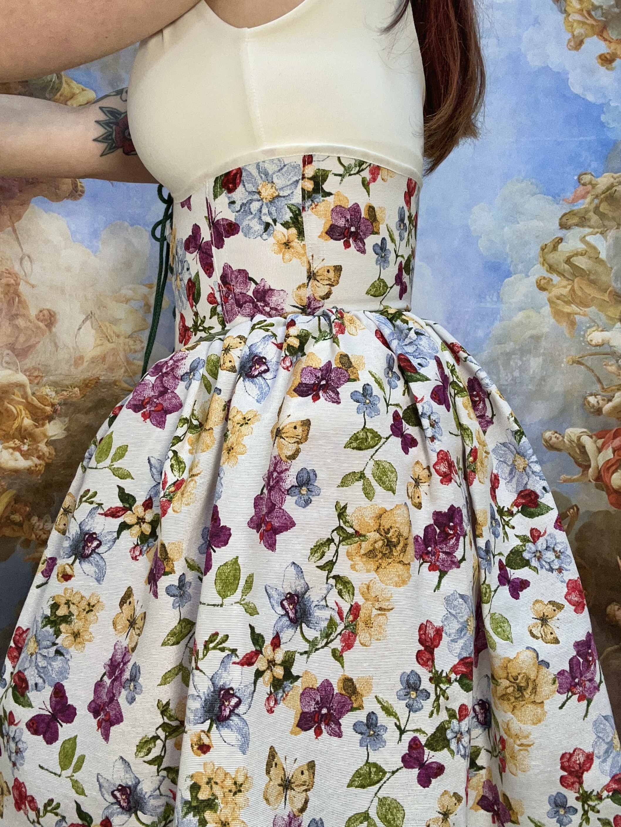 The floral fabric includes butterflies and orchids; the top edge of the underbust is in a pearl shade and the bottom one in an olive green color.
