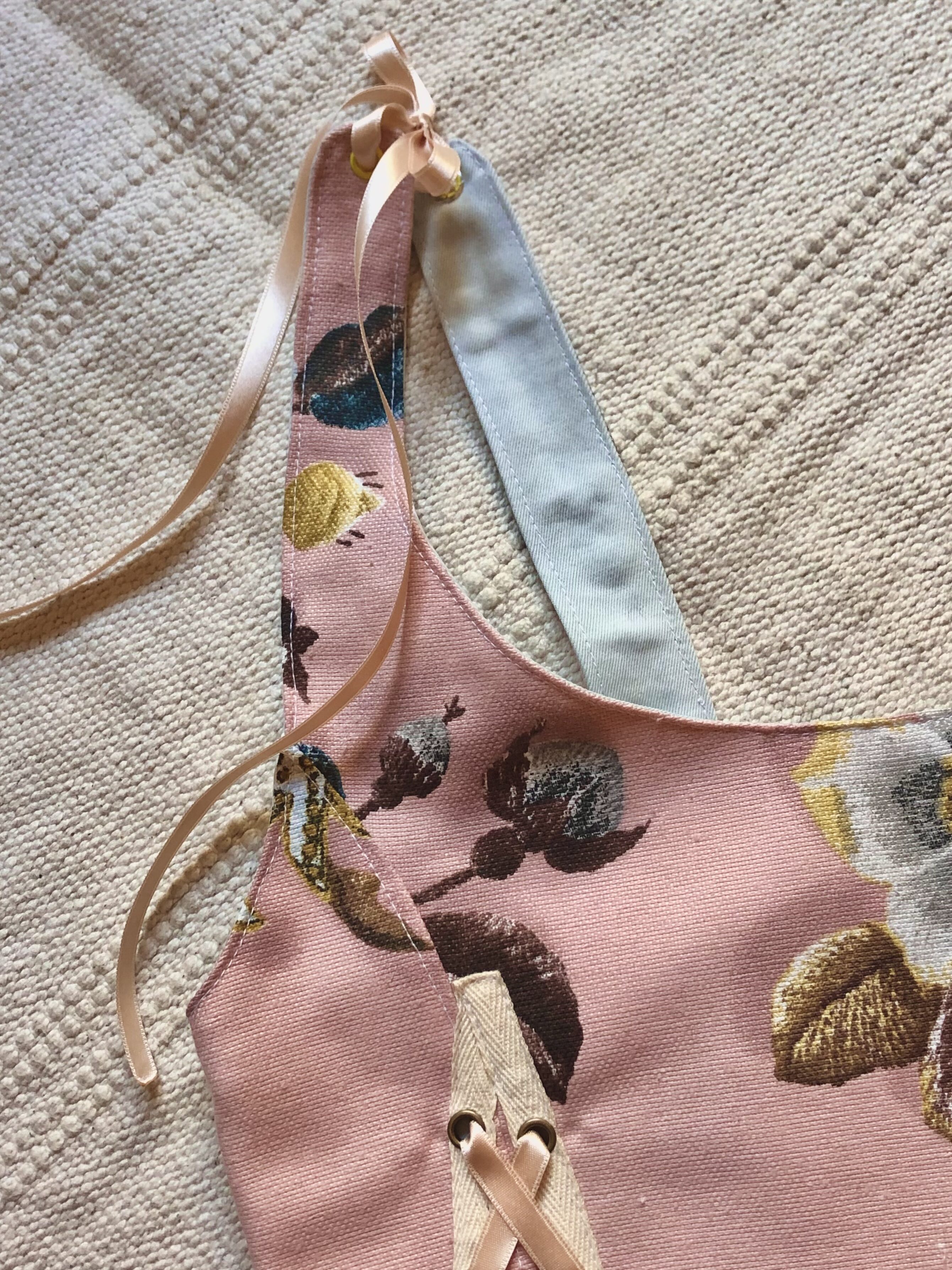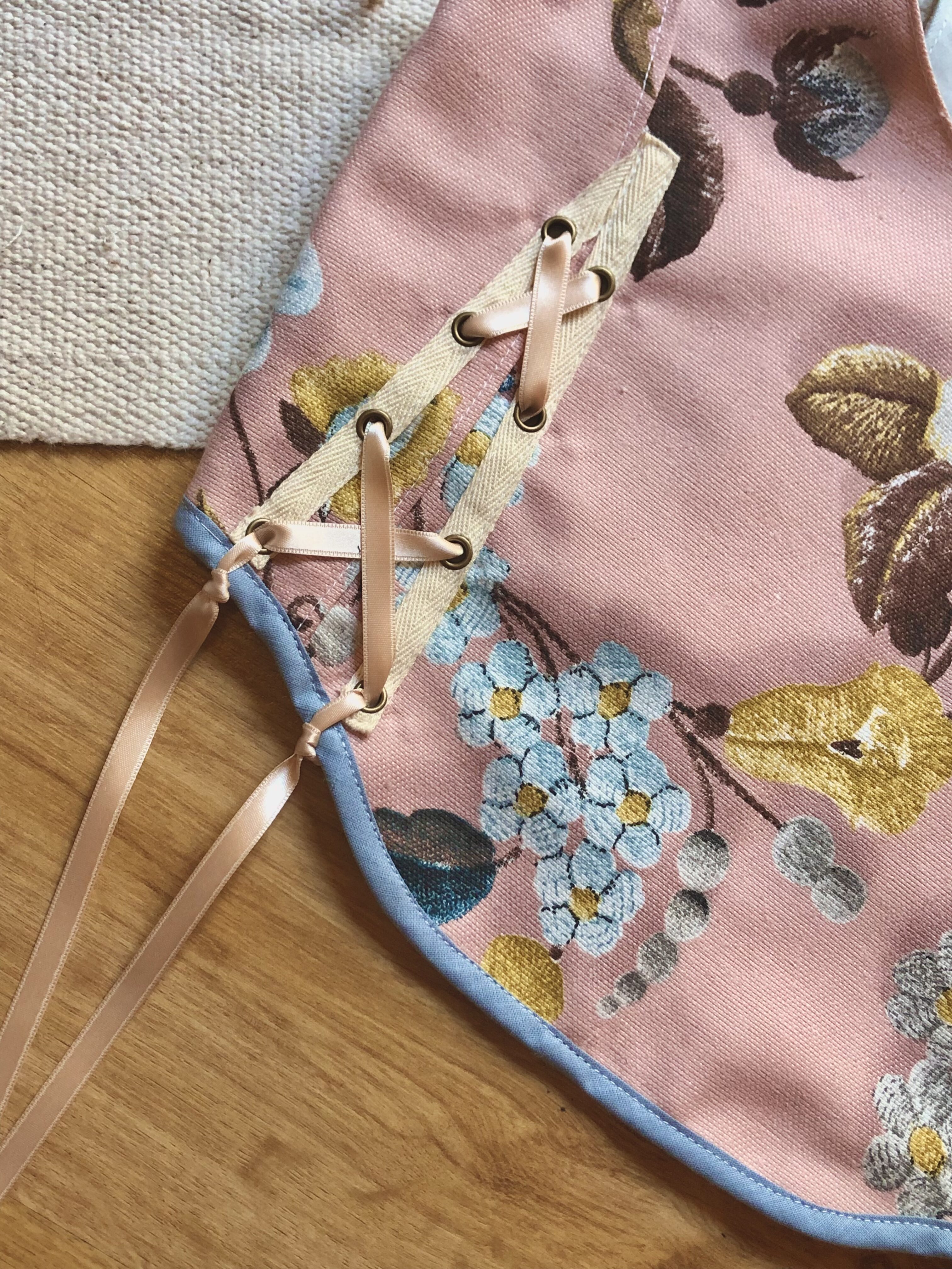 In a dusty pink floral fabric, this piece includes two decorative openings, laced with a cream satin ribbon, and a dusty blue bottom edge.