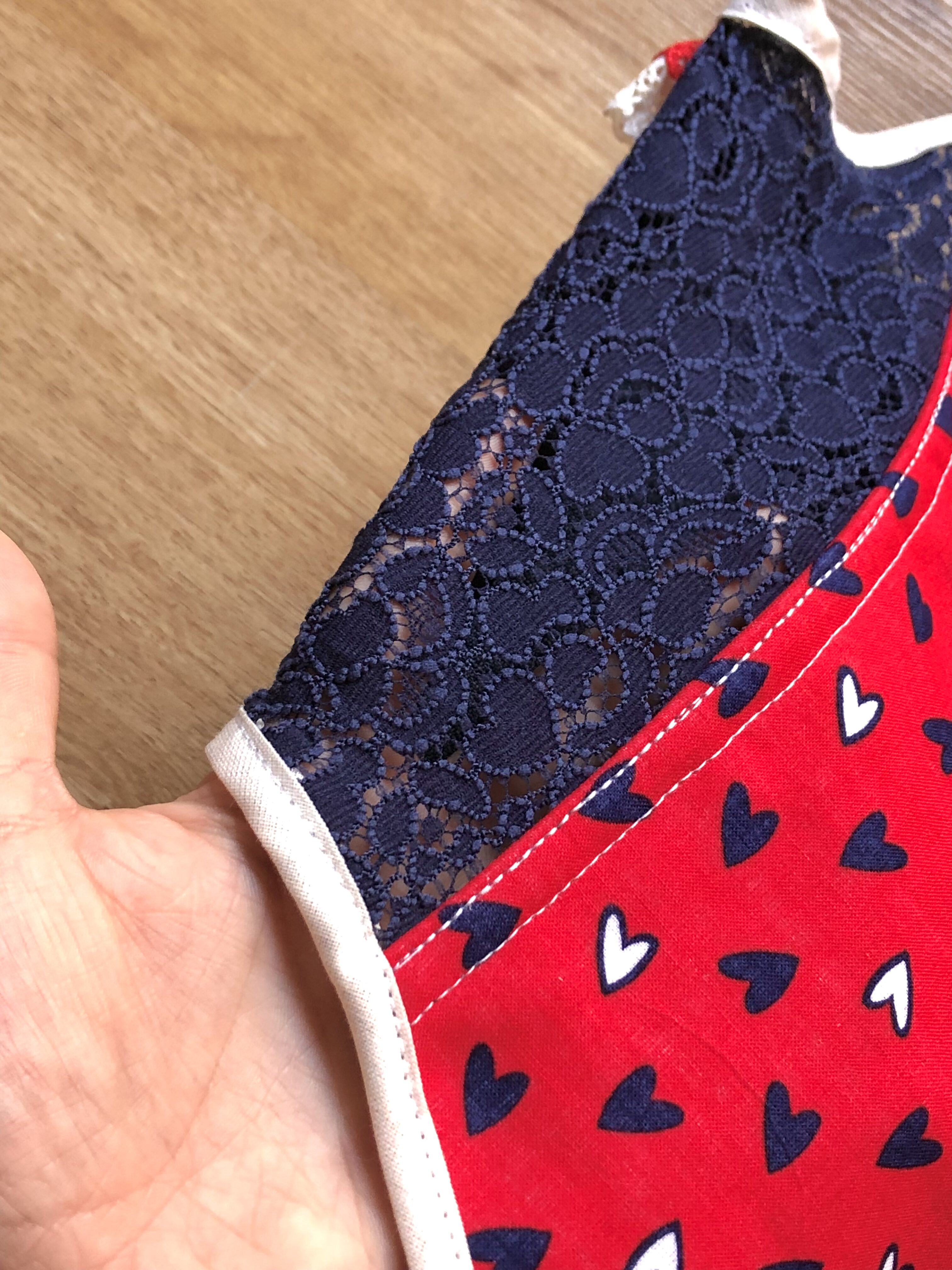 This piece has a red heart fabric on the front and back, whilst the laterals are in a fully transparent navy lace.