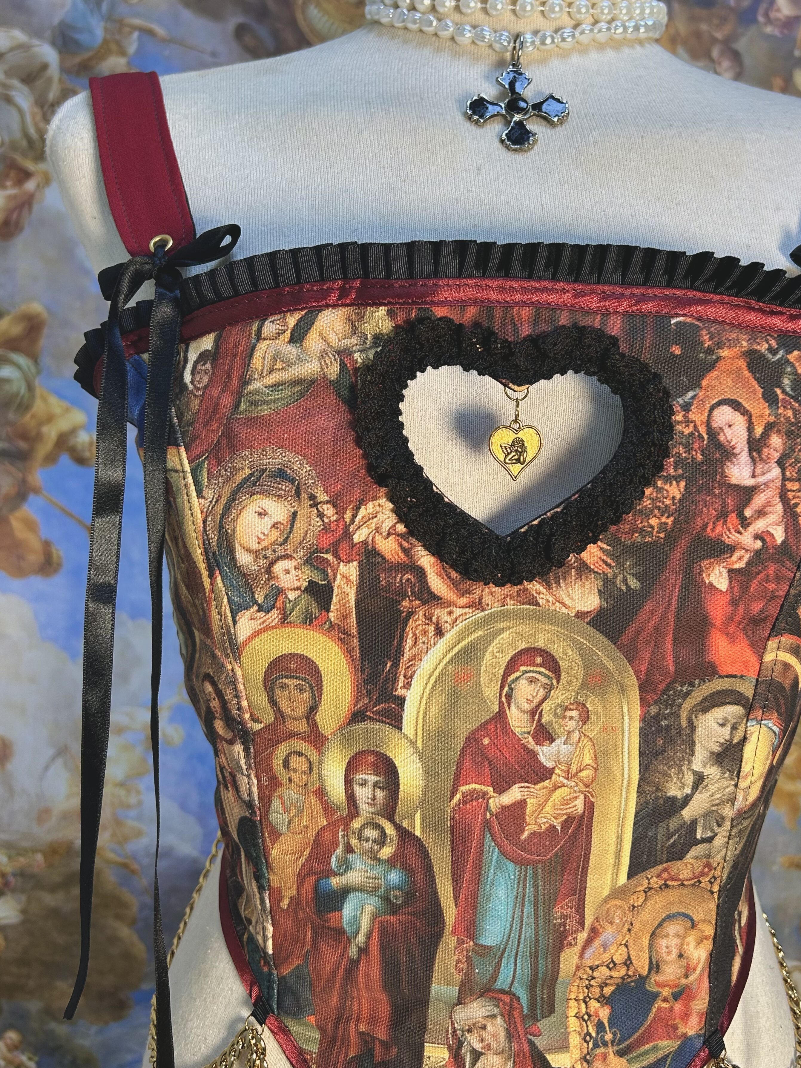 From the capsule collection ‘Síndrome’ presented at Vancouver Fashion Week: a saints themed piece with straps closing on the chest + back, by black satin ribbons.