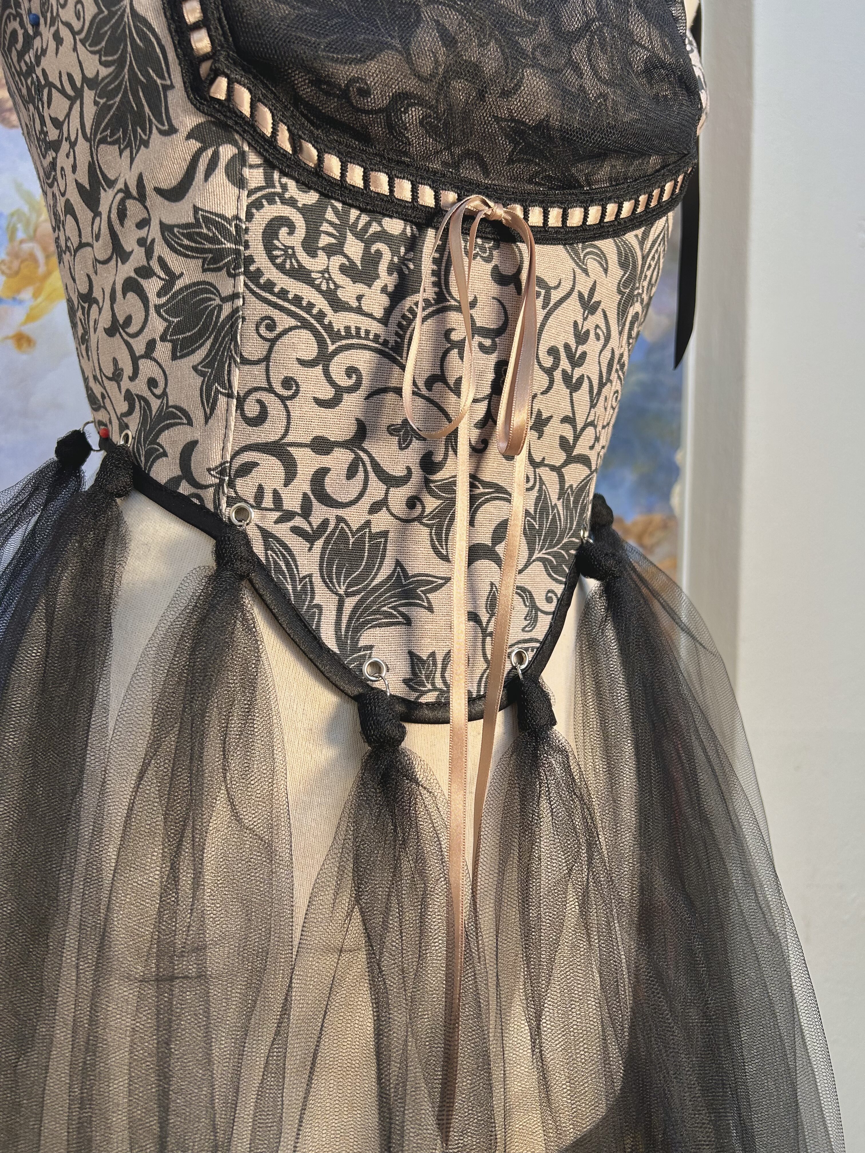In a baroque taupe & black fabric, this piece as a black tulle paneling over the bust area, delimitated by a textured black ribbon, tied by cream stain ribbon.